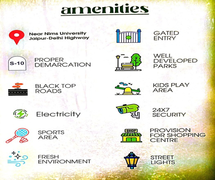 Opposite Nims University, a great location for youπ\\r\\nπ£ Located on main 80 feet road, with excellent development, a chance to fulfill your dreams π \\r\\nπ₯ π΄π₯π΄π₯π΄π₯\\r\\nFarm House Size 1000 sq. yd to 5000 sq. yd, as per your choice\\r\\nAmenities:- ππ»\\r\\nπ Govt.Approved \\r\\nπ Premium Gated Entry\\r\\nπ 24x7 Security\\r\\nπ Well-equipped Asphalt Road\\r\\nπ Dense greenery with more than 15 lakh trees\\r\\nπ Well-equipped More than 1 Park\\r\\nπ Temple\\r\\nπ Kids Play Area\\r\\nπ Retail Shopping Area\\r\\nπ Road Light, Water Facility\\r\\nπ Water Harvesting System\\r\\nπ Proper Demarcation\\r\\nπ₯And\\r\\nπ₯And\\r\\nπ₯And....Easy Loan Facility from Leading Banks....